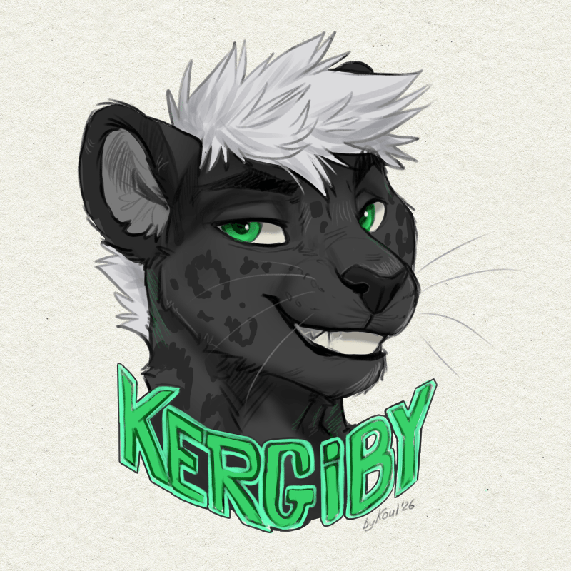 Kergiby is a panther who has been in the furry fandom since 2010. He began his writing in the fandom on SoFurry and has continued off and on since. He is a contributor to the podcasts Dinner at Yiffany’s, as well as The Voice of Dog where he also occasionally lends his voice.