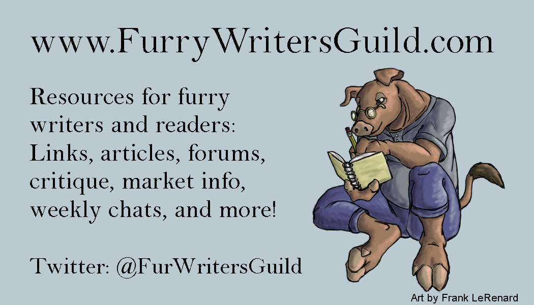 - Help keep markets (and our website) updated. Here’s another one everyone can do. If you run across a publication that might be open to furry-themed fiction or just one you think might be of interest to our writers generally, post it in the Calls for Submissions thread or email me at furwritersguild at gmail. If it’s specific enough to furry writing, I’ll add it to our website’s market pages. Same goes for conbooks — if you know of a convention coming up that’s open to conbook submissions but isn’t yet listed on our Conbooks page, just make a post or send an email, and I’ll get it added ASAP. And if you have any other resources to add to our website, anything from a link to a story generator or writing software or a great writing blog, just let me know. I want to keep adding as many good resources to our website as I can.